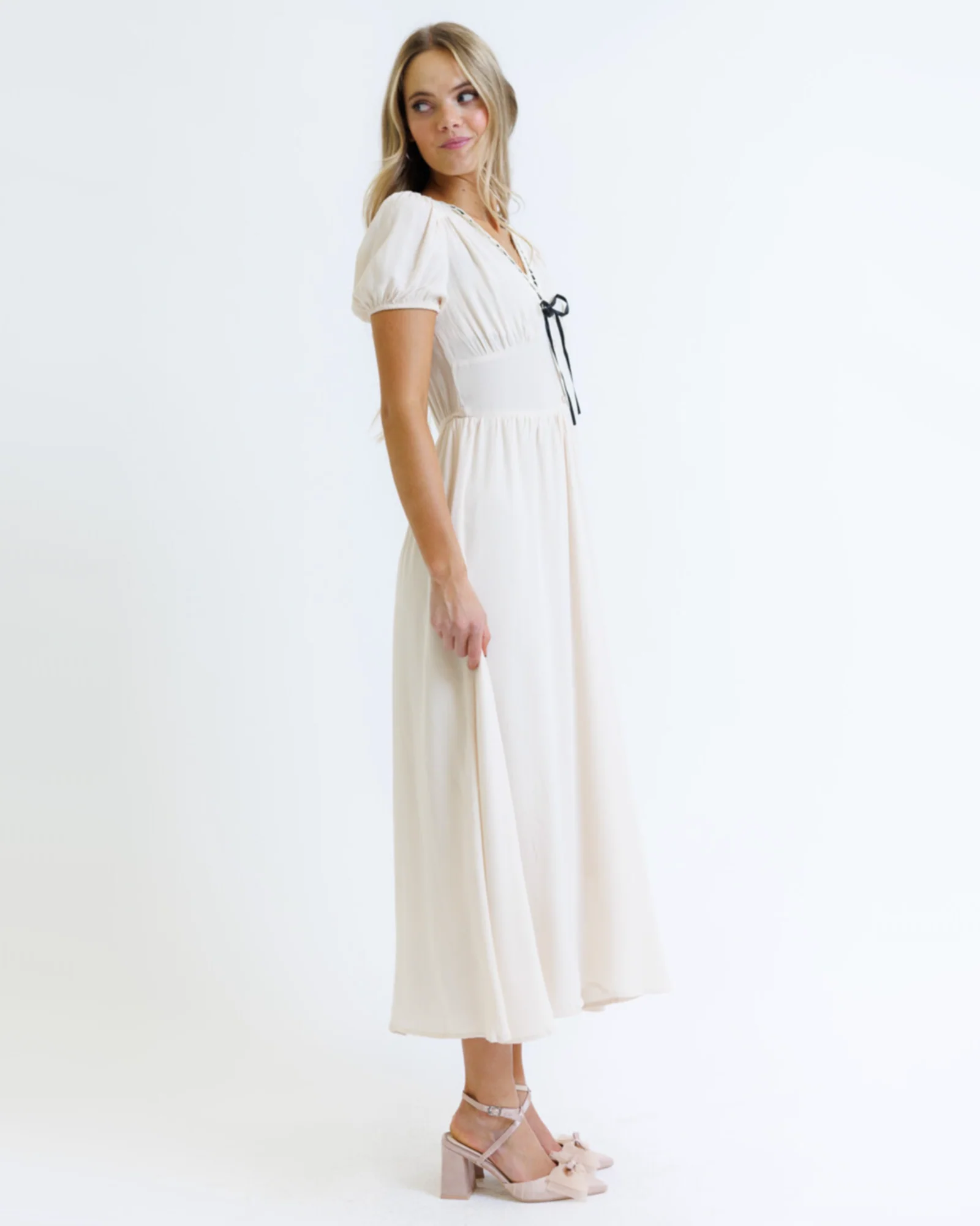 - V-neckline with black ribbon detail